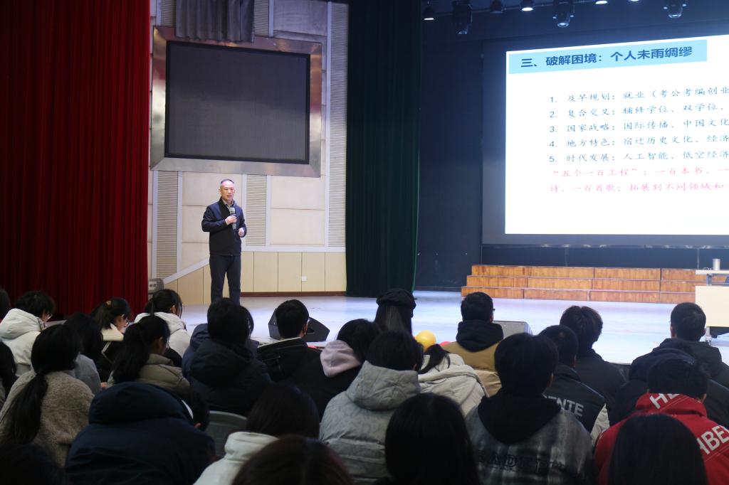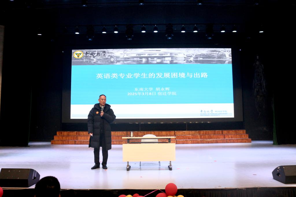 3月8日上午,东南大学外国语学院胡永辉教授在宿迁学院大学生活动中心为外国语学院学生作了一场题为“英语专业类学生的发展困境与出路”的专题讲座。本次讲座由外国语学院副院长王善江教授主持,24级全体学生和23级行知班学生参加。