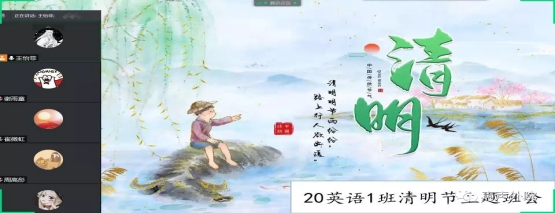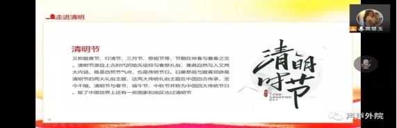 为追寻英雄足迹,继承先烈遗志,庚续红色精神血脉,同时让在校同学感受到校园内的春日风光,丰富校园生活,激励同学们热爱校园、积极向上的精神。清明期间,外国语学院举行了“网上祭英烈”活动、“清明校园踏青,共赏初春美景”摄影活动及清明主题班会。