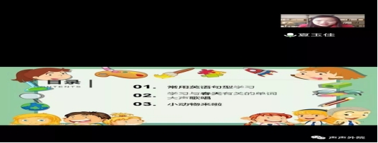 本次活动旨在设计英语趣味课堂,激发大家学习英语的兴趣。志愿者夏玉佳和傅庄社区三、四、五年级的学生们进行“趣味英语课等你来学习”课堂活动。首先,夏玉佳同学利用丰富的PPT讲解日常所用到的英语句式;接着,介绍与春天相关的单词,并和同学们合唱英文歌曲《Spring is here》;最后,运用关于小动物的知识进行趣味学习,将英语学习融入到活动中。本周的傅庄社区线上爱心课堂圆满结束,傅庄社区同学们收获知识的同时也在疫情期间收获不少欢声笑语。