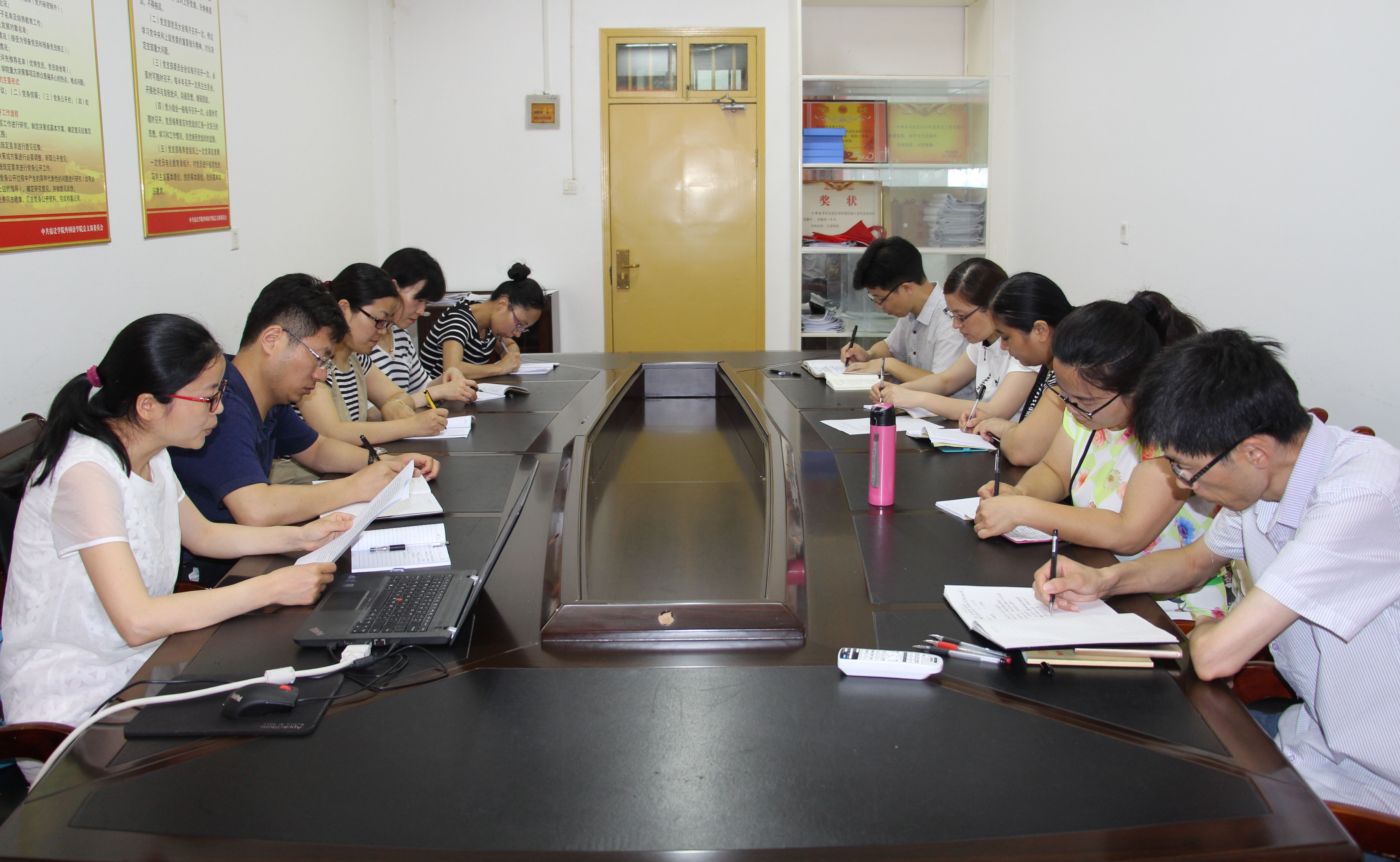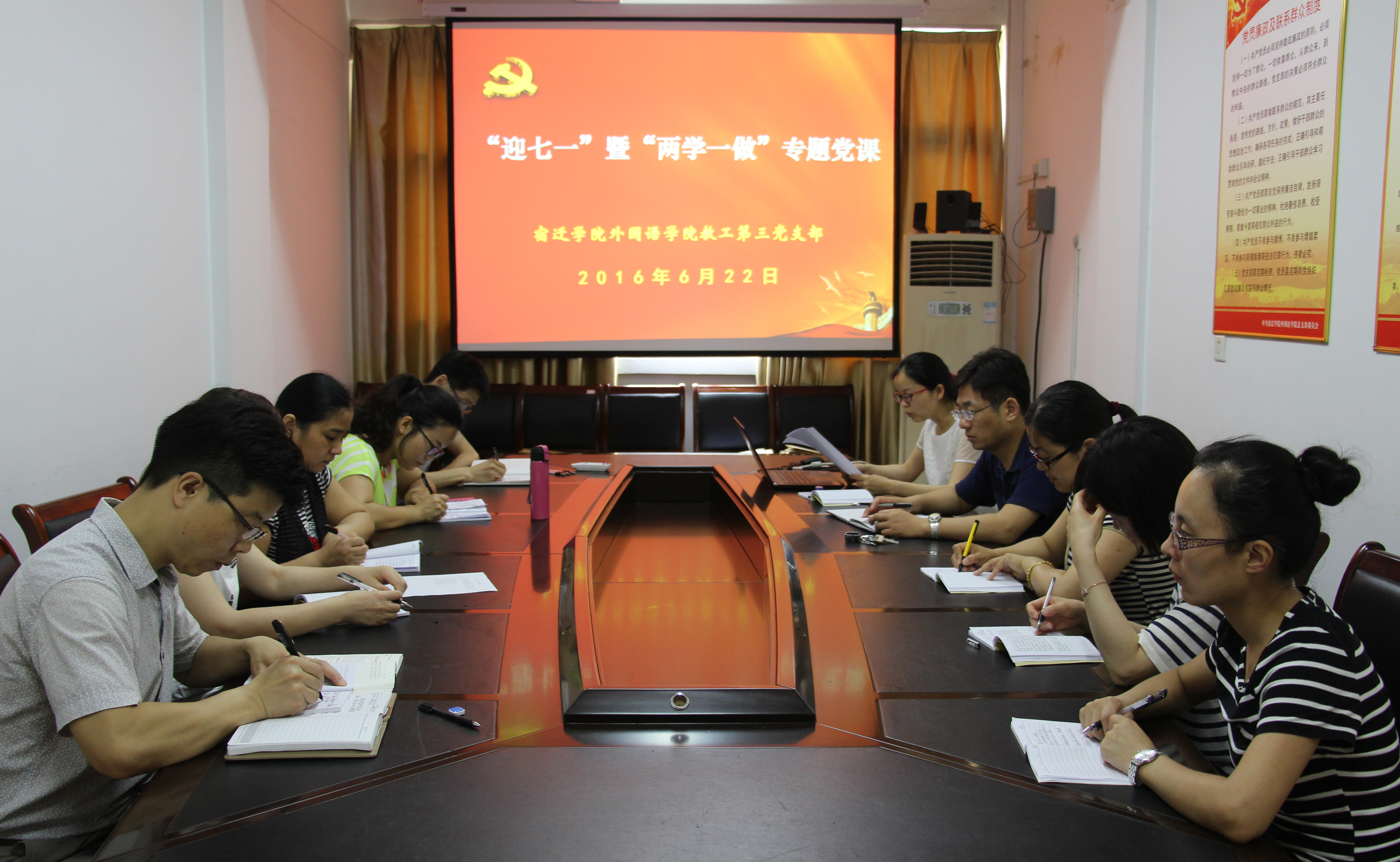 2016年6月22日上午,外国语学院教工第三党支部在院会议室举办了“迎七一”专题党课暨“两学一做” 专题大讨论活动。张福荣同志为支部党员主讲了《中国共产党廉洁自律准则》,李勤同志组织支部党员讨论了“新时期共产党员思想行为规范”,郝成淼同志带领支部党员学习了“党的组织生活十项基本制度概要”。