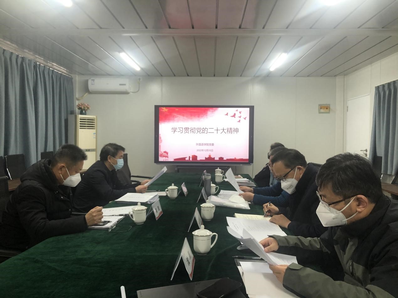 2022年12月15日下午,外国语学院党委召开中心组理论学习研讨会。副校长施正荣在后勤处处长吴凯的陪同下巡学旁听。