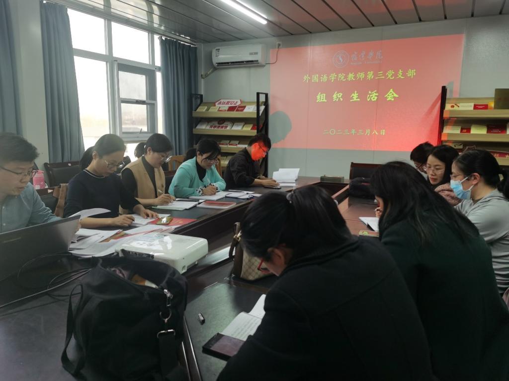 按照党委关于开展2022年度民主评议党员工作的部署,外国语学院教师第三党支部支委会研究决定了具体实施方案,组织党员认真填写了民主评议党员登记表,分两个小组开展了谈心谈话,对党支部增强政治功能和组织功能等方面指出了问题和不足,对党员个人政治信仰、党员意识、理论学习、能力本领、作用发挥、纪律作风等方面指出了问题和不足,并征询了意见建议。在此基础上,2023年3月8日,党支部在8214会议室召开组织生活会,并进行专题党课学习,党员11人全部出席,副院长沈刚同志参加。党支部书记郝成淼同志领学了《党的二十大报告学习辅导百问》《二十大党章修正案学习问答》等辅导材料部分内容,并代表支委会班子作了2022年度工作报告并听取意见建议,党员开展了批评与自我批评。最后,进行了支委会班子民主测评和党员民主测评。