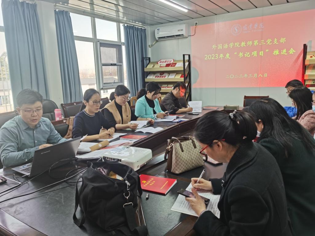 2023年3月8日,外国语学院教师第三党支部在8214会议室召开2023年度“书记项目”推进会,党支部全体党员出席。学习宣传贯彻党的二十大精神是当前和今后一个时期的首要政治任务,根据党委关于开展2023年度基层党建“书记项目”的部署,外国语学院教师第三党支部基于党员专业特点,排定名称为“‘学研译介’党的二十大精神”的基层党建“书记项目”。推进会上,党支部书记郝成淼同志对项目的具体措施及进度安排进行了说明。深入开展学习、研究、翻译和宣介党的二十大精神系列活动,旨在推进党建工作和事业发展深度融合。