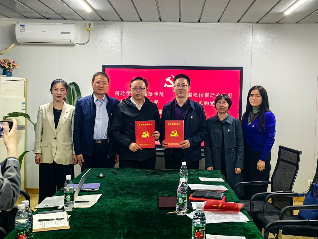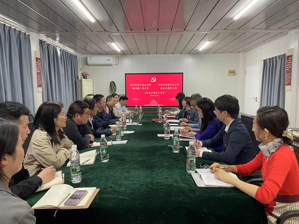 为深入贯彻落实习近平总书记关于教育数字化等重要指示精神,凝聚思想共识,实现资源共享,2024年4月24日下午,外国语学院教师第一党支部与中国电信宿迁分公司政企采购党支部开展结对共建活动。此次活动由外国语学院教师第一党支部书记詹慧芳主持。