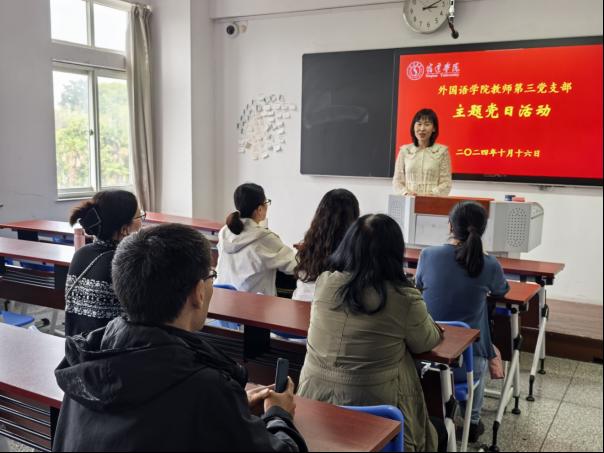 10月16日下午,外国语学院教师第三党支部在1203教室开展“弘扬爱国主义精神”主题党日活动。党员教师集中观看了庆祝中华人民共和国成立75周年微纪录片《共和国·勋章》视频;组织委员荣玉同志领学了习近平总书记关于“大力弘扬伟大爱国主义精神,把强国建设、民族复兴伟业不断推向前进”的重要论述;党员教师结合总书记的重要论述,围绕把弘扬和实践中华民族爱国主义精神融入教育教学工作开展了讨论。
