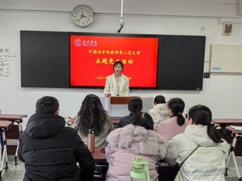 11月20日下午,外国语学院教师第三党支部在1203教室开展11月份主题党日活动。党员教师观看了深入学习贯彻习近平总书记关于全面深化改革的一系列新思想、新观点、新论断和党的二十届三中全会精神的视频;组织委员荣玉同志领学了习近平总书记给中国国际大学生创新大赛参赛学生代表的回信,以及《光明日报》理论文章《习近平文化思想的哲学意蕴》;党员教师结合主题学习内容,围绕如何以实际行动把理论精髓落实到具体工作之中开展了讨论交流。