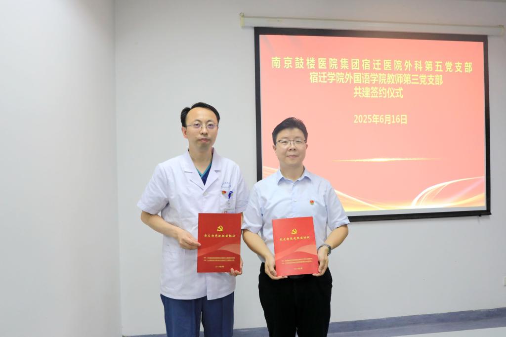 近日,外国语学院教师第三党支部支委会成员3人赴南京鼓楼医院集团宿迁医院,与外科第五党支部签订《党支部党建联盟协议》,并举办支部共建启动仪式。双方将加强交流合作,发挥各自优势,并牵头引入资源,共同谋划实施党建共建项目,促进党建工作与业务工作深度融合,探索党建工作新思路新方法,共同打造具有特色的党建品牌。