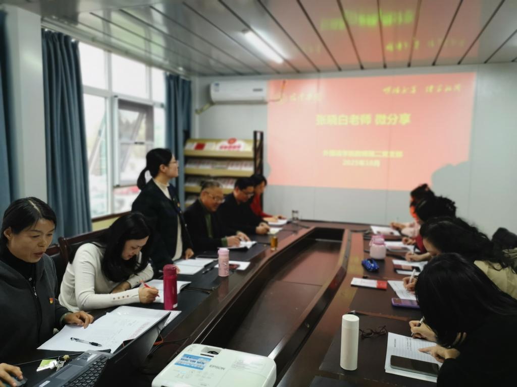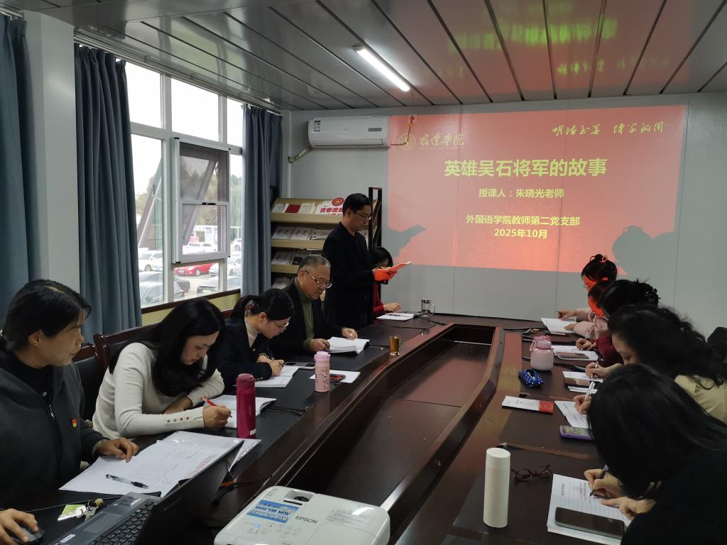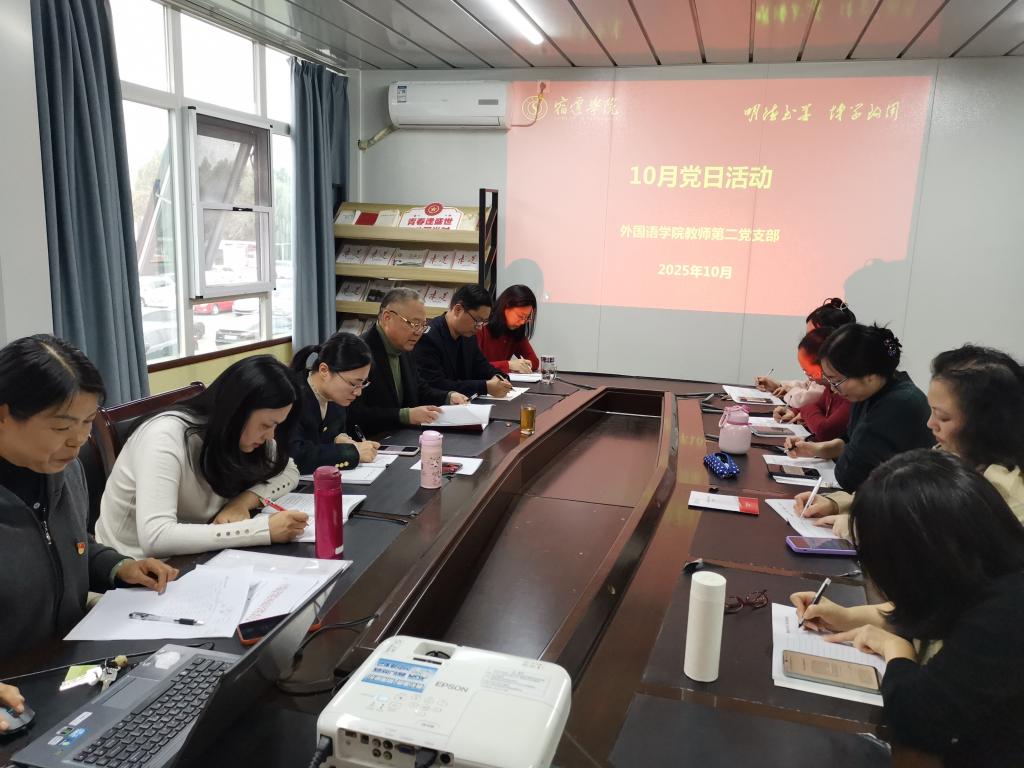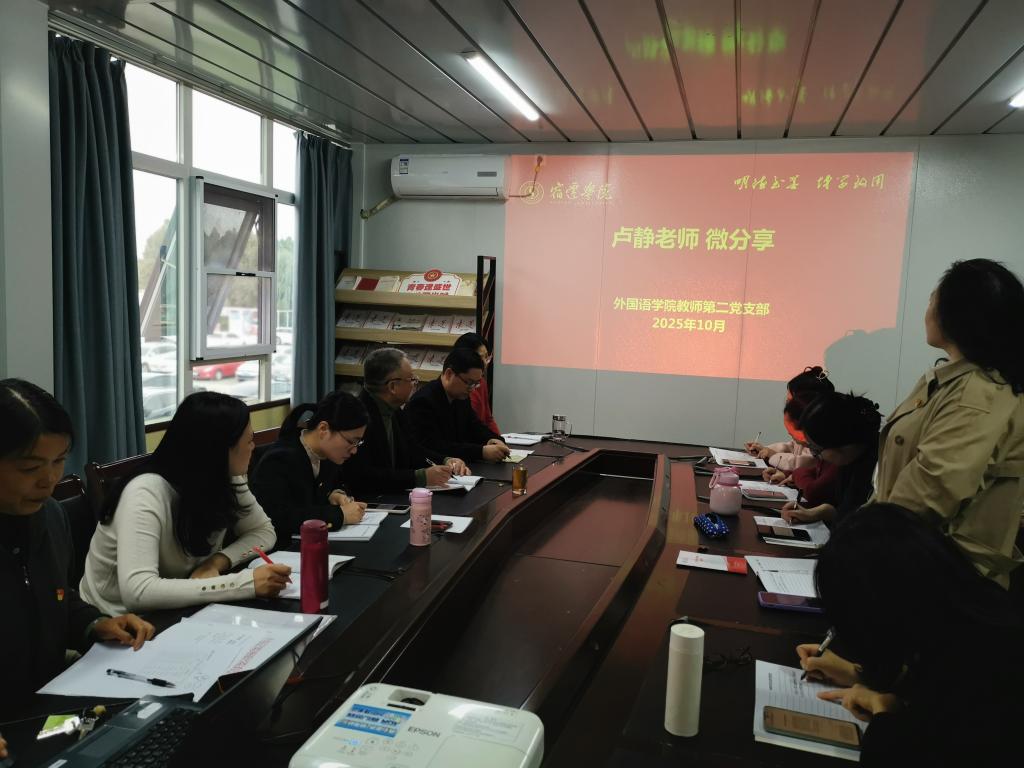 活动中,党员集中观看习近平总书记给天津大学全体师生回信视频,深入学习《习近平治国理政》第五卷中“以教育之强夯实国家富强之基”内容。围绕服务国家战略、提升人才培养质量等主题,党员们展开热烈研讨,凝聚奋进共识。个性分享环节亮点纷呈,范开芳、刘文琼、卢静、张晓白、朱晓光等党员分别做了微分享活动,涵盖教育家精神践行、国庆坚守者事迹、“卡脖子”技术突破、师德师风建设以及革命先烈故事等内容,推动党建与业务深度融合。会上还传达了《宿迁学院外国语学院基层党组织建设“双双工程”实施方案》,明确基层党建工作重点方向。