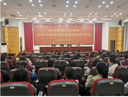 第二巡察组有关成员、外国语学院班子成员和全体在校教职工参加会议。