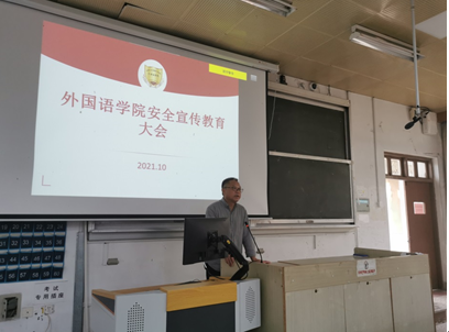 10月6日下午,外国语学院在四阶召开安全宣传教育大会,特邀保卫处负责人就消防安全作专题培训。会议由外国语学院党委书记管志强主持,全体教职工参加。