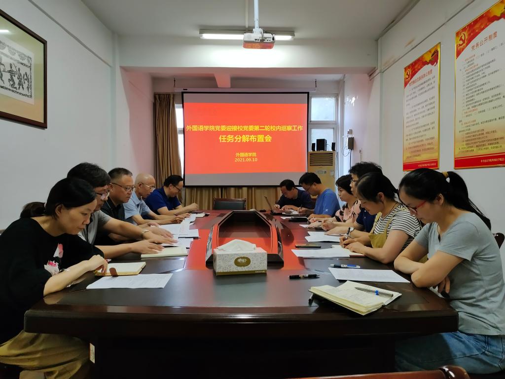 根据外国语学院党政联席会议通过的“迎接校党委第二轮校内巡察工作实施方案”的要求,外国语学院于9月10日下午16:00在学院210会议室召开了“迎接校党委第二轮校内巡察工作”任务分解布置会。外国语学院院长于兴亭、党委书记管志强、副院长沈刚、副院长王纯磊参加了此次任务分解布置会,会议针对校党委第二轮校内巡察要求提供的材料清单逐一进行分解,责任到人,成立了综合协调小组、材料组和宣传组,并明确了各小组负责人。迎巡领导小组要求相关责任人员要提高政治站位,在规定时间内保质保量的完成相应工作。