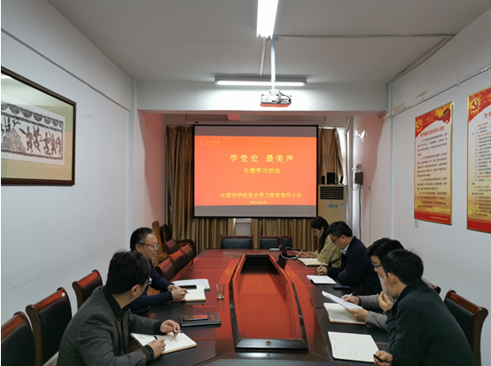 4月25日,外国语学院开展“学党史金句,诵最美声音”党史学习教育专题活动,参加此次活动的是外国语学院党总支书记管志强、副院长沈刚以及党史学习教育领导小组全体成员。
