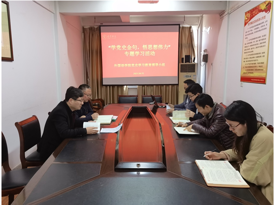 4月15日下午14:30,外国语学院开展了“学党史金句,悟思想伟力”专题学习教育。参加本次学习的有外国语学院党总支书记管志强、副院长沈刚以及外国语学院党史学习教育领导小组全体成员。