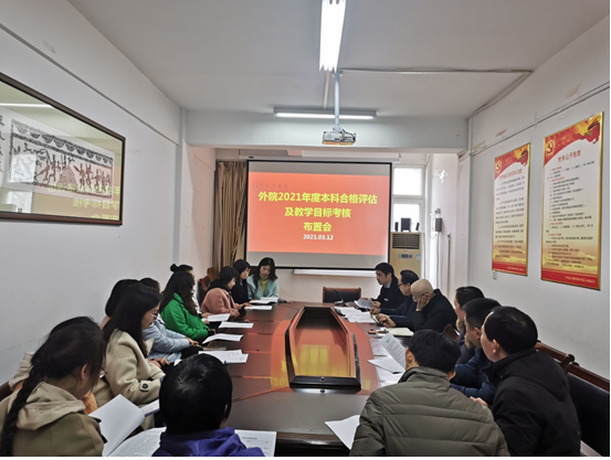为了迎接2021年度本科教学工作合格评估,充分做好参评各项准备工作,外国语学院于2021年3月12日下午召开本科教学工作合格评估暨教学目标考核布置会。会上于兴亭院长强调,提高站位,认真解读指标体系,加强工作针对性和有效性;评估工作要兼顾课程思政建设。