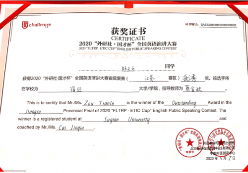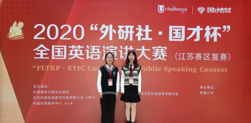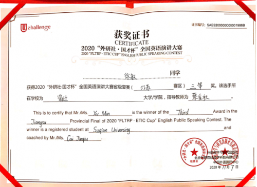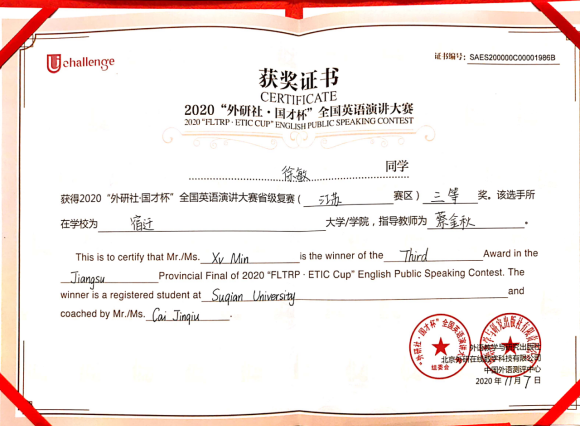 2020年11月6日,“外研社杯”全国大学生英语演讲比赛江苏赛区复赛在南通大学举办,我校学子在比赛中喜获佳绩。2018级英语3班徐敏荣获全国英语演讲大赛省级复赛三等奖,2019级英语师范1班邹天乐荣获省级复赛优胜奖,指导教师蔡金秋。