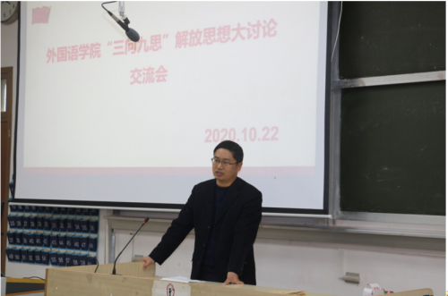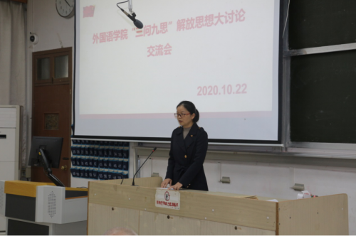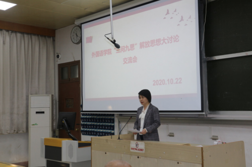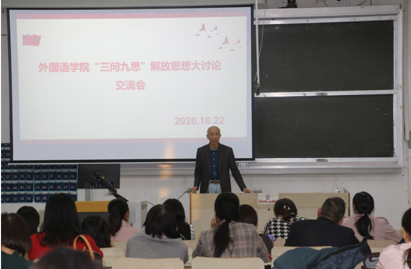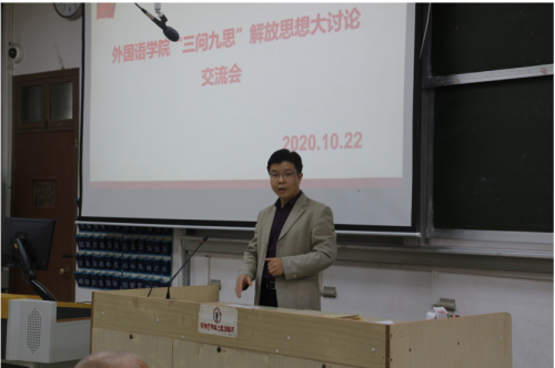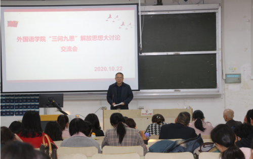 2020年10月22日下午外院在四阶举行“三问九思”解放思想交流活动。会议围绕如何学好学透“三问九思”这个主题,如何深入落实“以学促改,学以致用”这两根主线,如何提高我院师资队伍建设水平、人才培养质量、服务地方能力这三大工程,展开交流讨论。