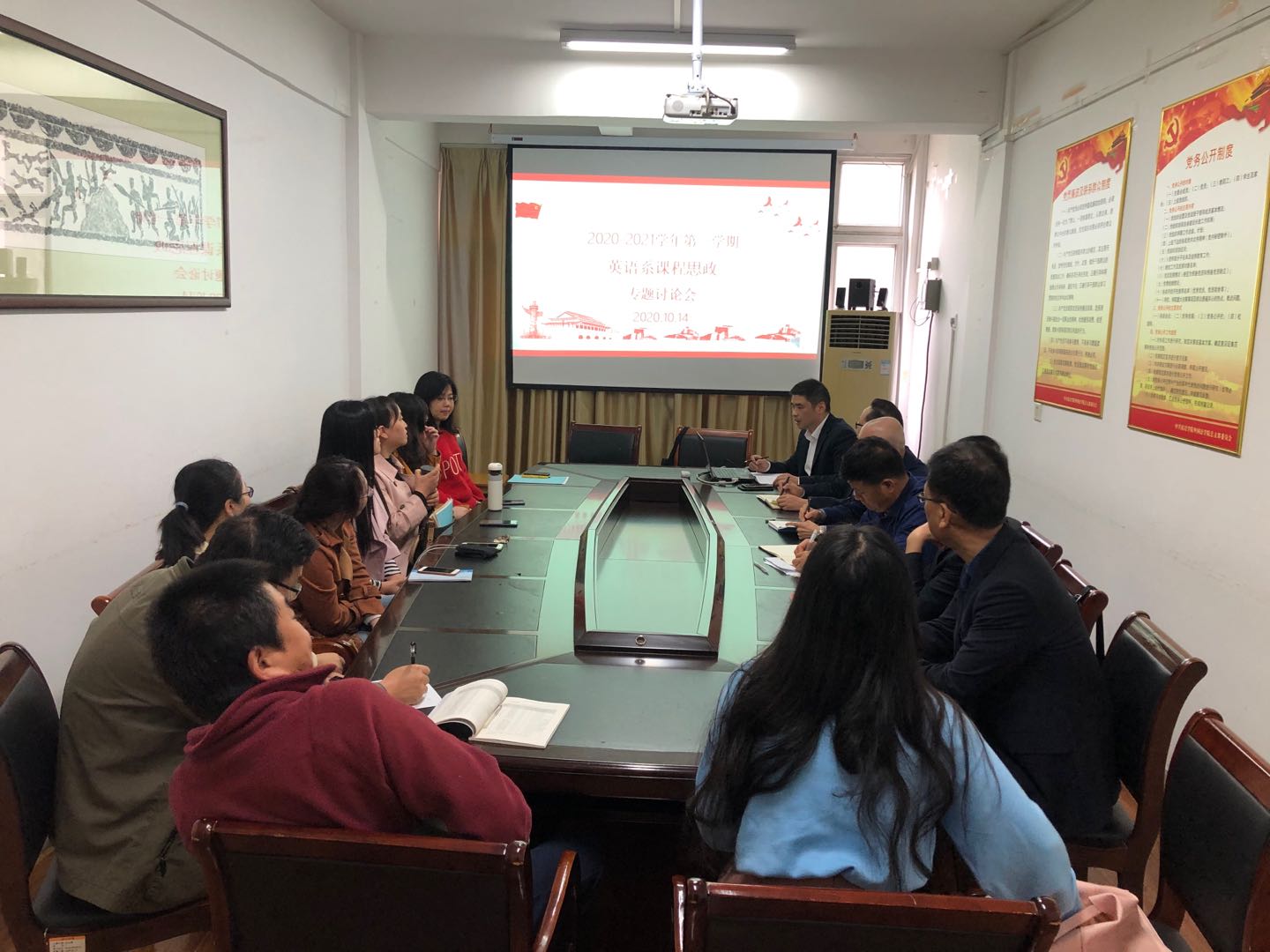 2020年10月14日下午3点,外国语学院英语系围绕《综合英语》课程思政召开专题研讨会。在此次研讨会中,外国语学院于兴亭院长强调各门课程要与思政教育紧密联系,相辅相成,对学生进行全方位、多角度的思政教育,各类课程都要把“立德树人”作为教育的根本任务。