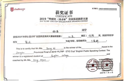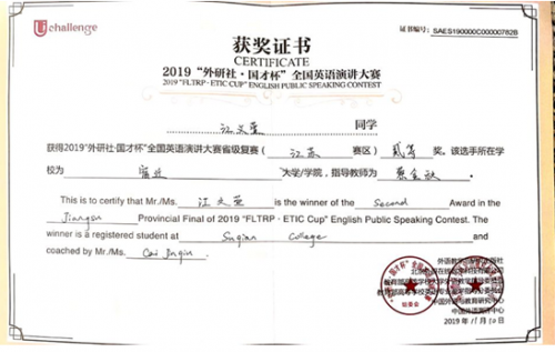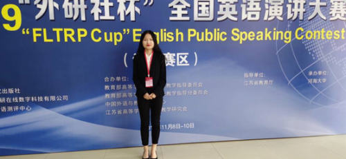 2019年11月8日,“外研社杯”全国大学生英语演讲比赛江苏赛区复赛在河海大学举办,我校学子在比赛中喜获佳绩。2018级英语师范2班江文萱荣获全国英语演讲大赛省级复赛二等奖,指导教师蔡金秋;2017级英语师范班杨茜荣获优胜奖,指导教师丁爱群。