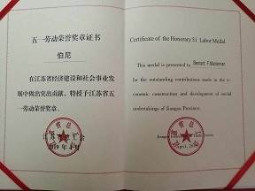 近日,我校加拿大籍伯尼老师被江苏省总工会授予江苏省五一劳动荣誉奖章。据悉,全省43名外籍友人被授予荣誉奖章。伯尼为外国语学院英语专业外籍教师,2014来到宿迁学院,主要教授《英语口语》《英语国家报刊选读》等课程,深受学生喜爱。