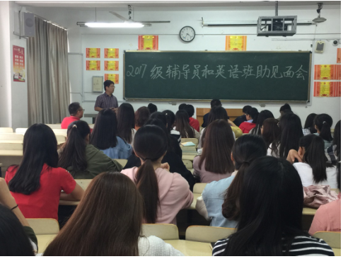 9月27日下午4点,在1304教室,外国语学院组织了2017级辅导员和英语班助见面会,会议由沈刚副院长主持,管志强书记做重要讲话,出席此次会议的人员有外国语学院15、16级英语专业共62位英语班助、各学院2017级辅导员代表以及谢静芳老师。
