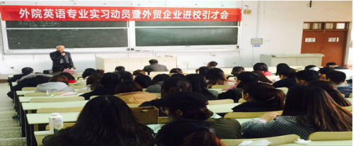 实习动员结束后,由学生处引荐的阿里巴巴宿迁服务中心组织的宿迁地区部分外贸企业面向同学们进行了宣讲。