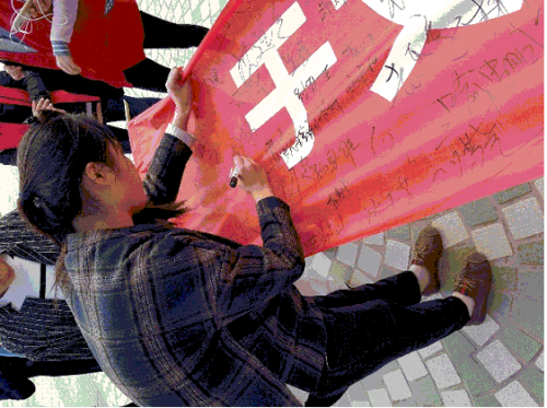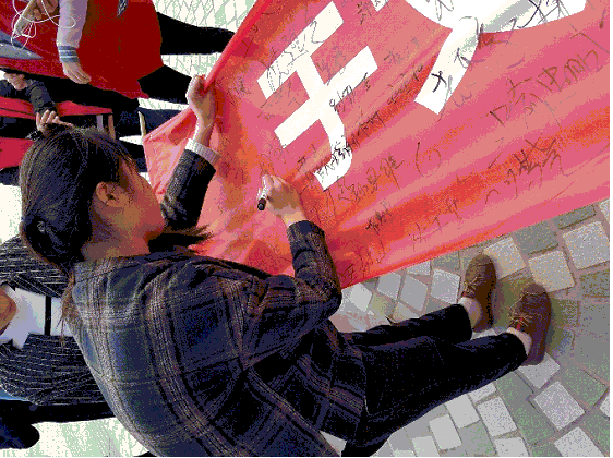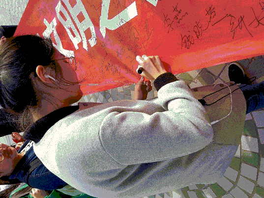 中午1:00整,外国语学院团总支的同学就在在几位副书记的带领下开始像过路的行人宣传创文行动,并呼吁他们参与到这一行动中来,愿意参与的同学们主动在横幅上进行签名,有的同学更是穿起了红马甲开始主动的清扫学校内的垃圾,把创文行动落实到了个人,实践到了小事上去。