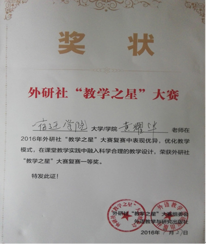 7月26日至29日,全国高校英语教学理论、策略与实践研修班暨2016年外研社“教学之星”大赛(第四期)在成都举行,我校外国语学院黄耀华老师进入全国决赛, 经过激烈角逐,最终凭借微课《Rhetorical Devices in Sonnet 18 by William Shakespeare》和现场精彩表现,荣获一等奖。