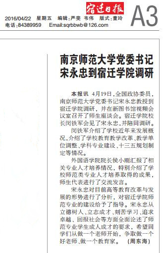南京师范大学党委书记宋永忠到宿迁学院调研