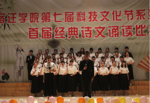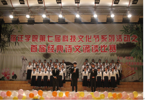 为弘扬中国文化,增强大学生的爱国之情,丰富大学生的校园生活,外国语学院于4月7日晚7:00在大学生活动中心举办了经典诗文朗诵比赛。本次比赛邀请了辅导员王姗,谢静芳,高雷老师以及校团委胡永奇同学担任评委。