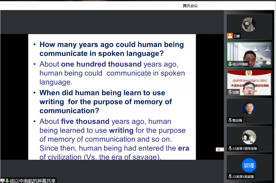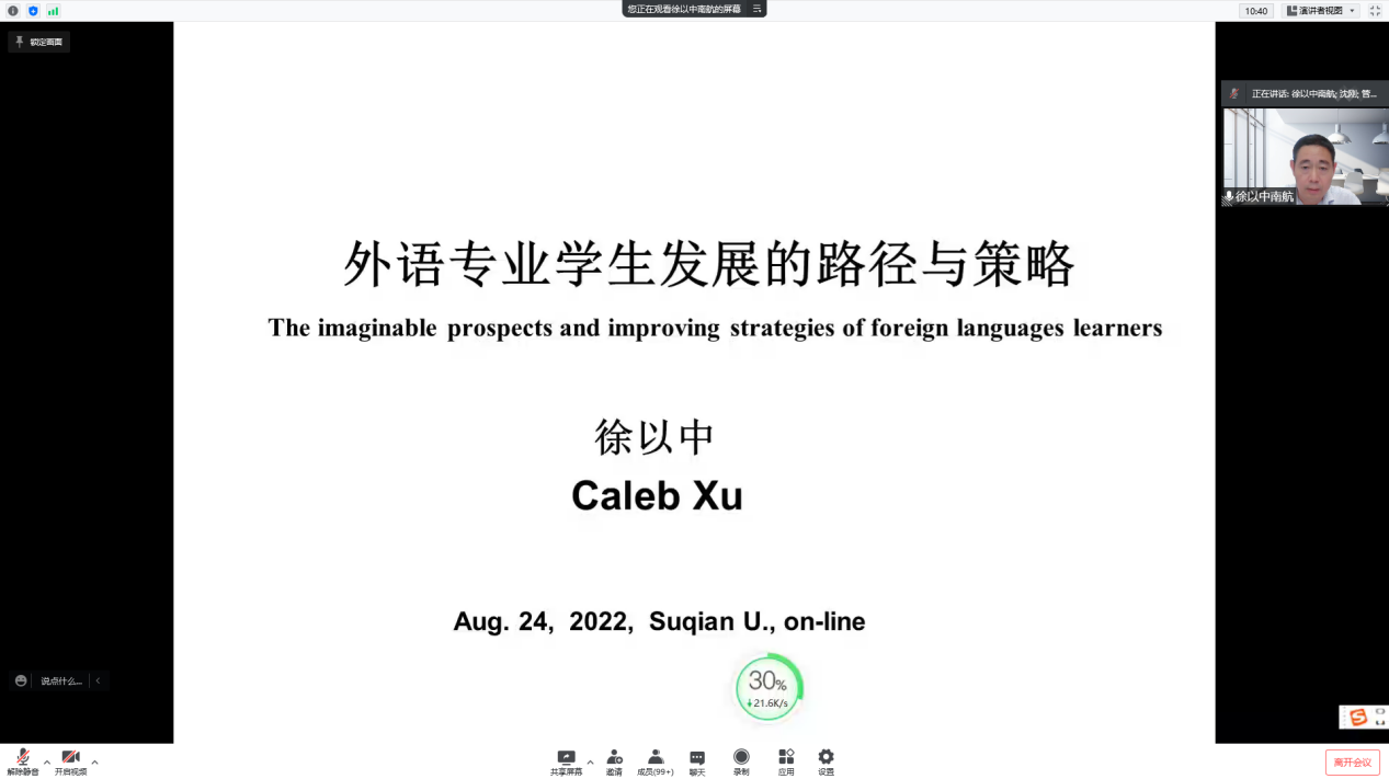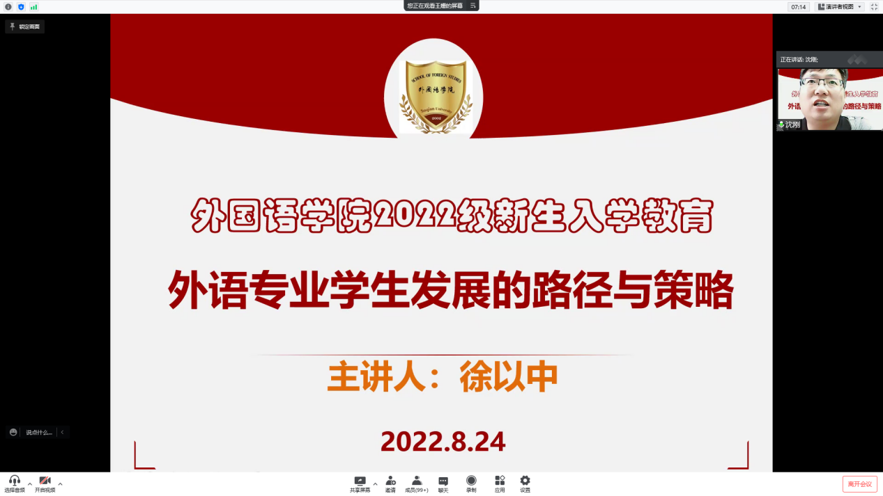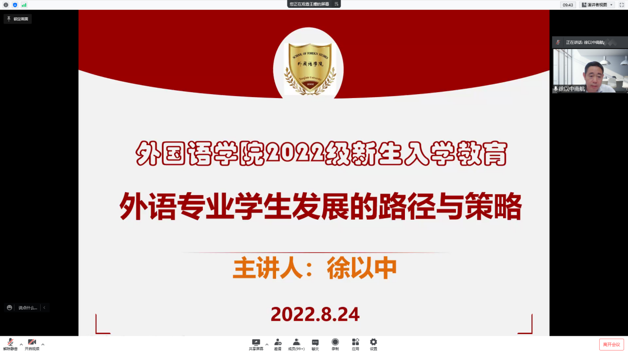 为帮助2022级新生尽快熟悉外语专业学习,掌握语言学习的方法,规划好专业发展,2022年8月24日下午,我院邀请南京航天航空大学徐以中教授给全体新生做了一场题为“外语专业学生发展的路径与策略”的专题讲座。外国语学院全体院领导、辅导员、班主任、班助以及2022级新生参加了此次讲座。