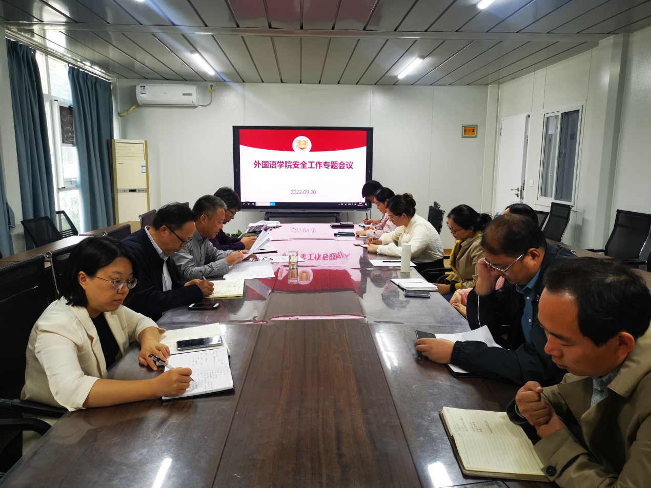 2022年9月20日,外国语学院在8108会议室召开安全稳定工作专题会议。学院党政领导班子、全体系主任、辅导员参加会议。