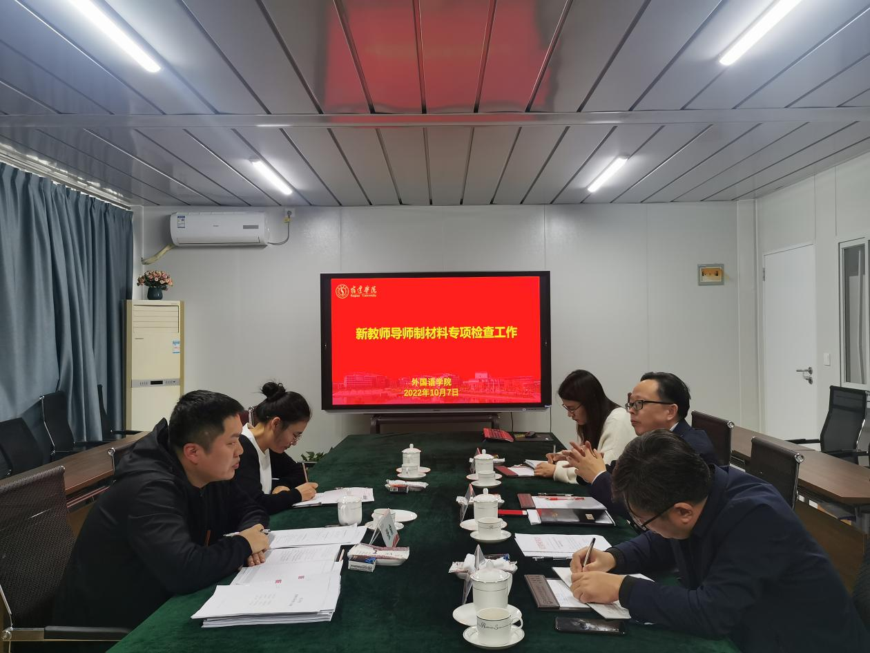 10月7日下午,人事处张俞科长和郑瑶老师到外国语学院督查新教师导师制工作,外国语学院副院长(主持工作)王纯磊、副院长沈刚参会。