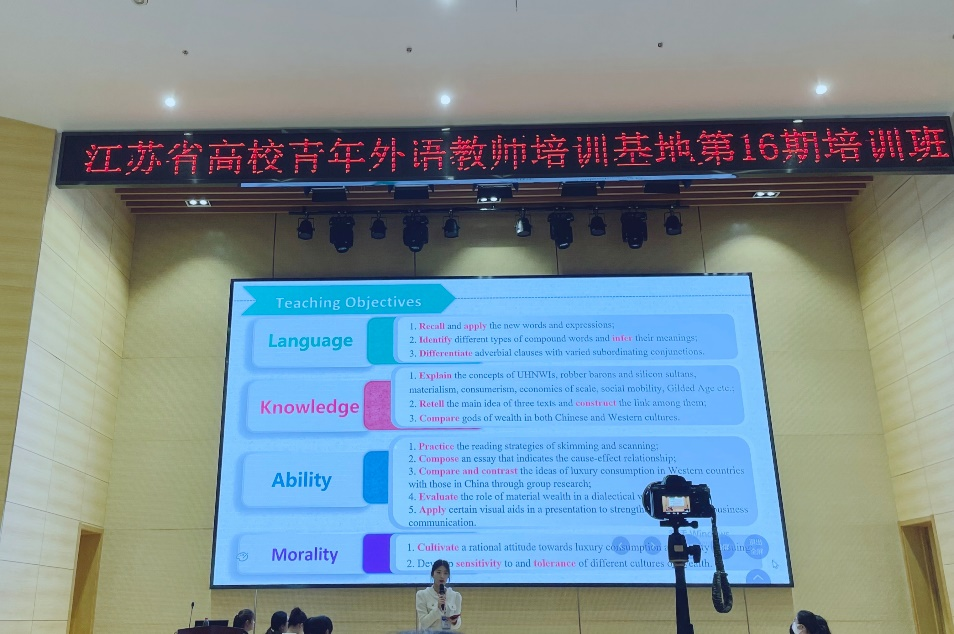 一直以来,外国语学院以教学为抓手,致力于提升教师的教学能力。此次培训,外国语学院另有5名教师作为学员到现场参与学习。近几年来,外院多位教师在省级以上教学竞赛中获奖,蔡老师于2022年获得“外教社杯”全国高校外语教学大赛全国总决赛商务英语专业组一等奖,代表了江苏省外语界的最高水平。