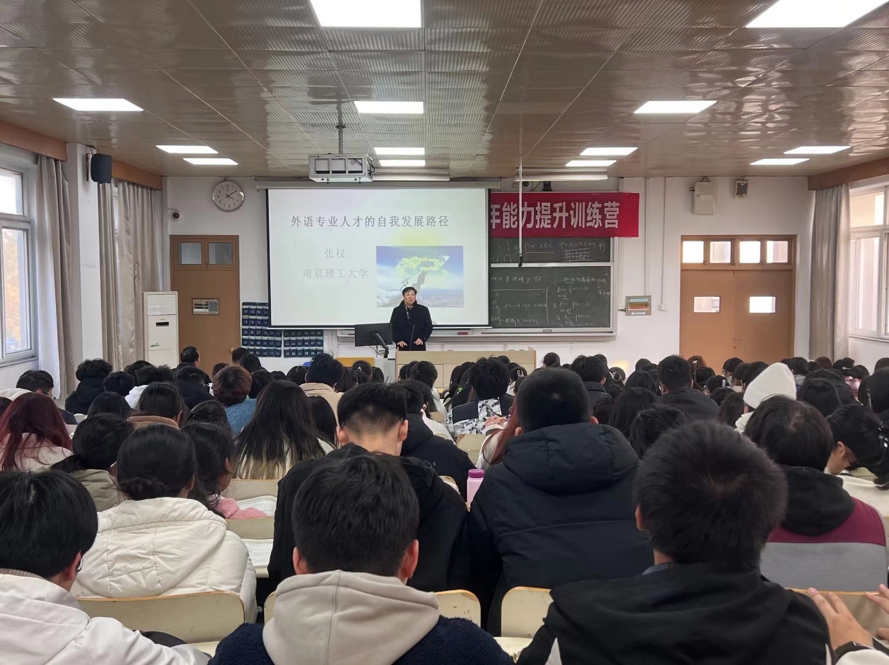 为帮助外语专业学生明晰自我定位,寻求专业发展,11月16日16:00外国语学院于第六阶梯教室举办了题为“关于外语专业人才的自我发展路径”的专题讲座。本次专题讲座由南京理工大学张权教授主讲,外国语学院党委副书记王倩、教师代表卫晓旭博士、辅导员李战成、2023级全体同学及行知班学生参加讲座。