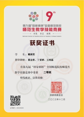 12月30-31日,第九届“田家炳杯”全国师范院校师范生教学技能竞赛决赛在浙江师范大学落下帷幕。我院英语(师范)专业21级英师1班戴婧雯凭借扎实的基本功与精彩的模拟课堂最终斩获二等奖。