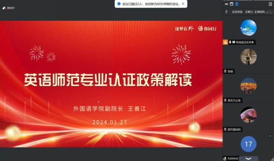 为全面推进英语专业师范认证工作,增强同学们对师范专业认证的认识,外国语学院于1月27至30日分年级召开了线上师范认证学生动员会。会议由各年级辅导员老师主持,学院党委委员、协助负责行政工作王善江老师主讲,四个年级英语(师范)专业学生参加。