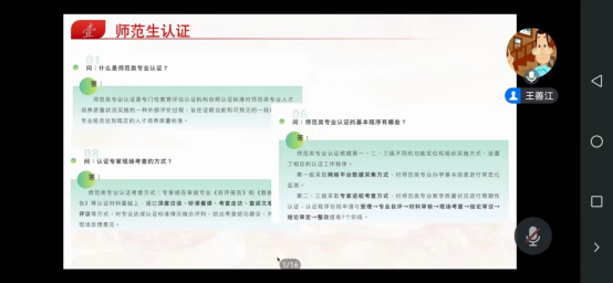 学院党委副书记王倩重点强调了学生在认证过程中的具体作用及考察要点,从学生角度指明师范专业认证的重要性和必要性,动员全体学生提高认识,提升专业能力,展示文明素养。