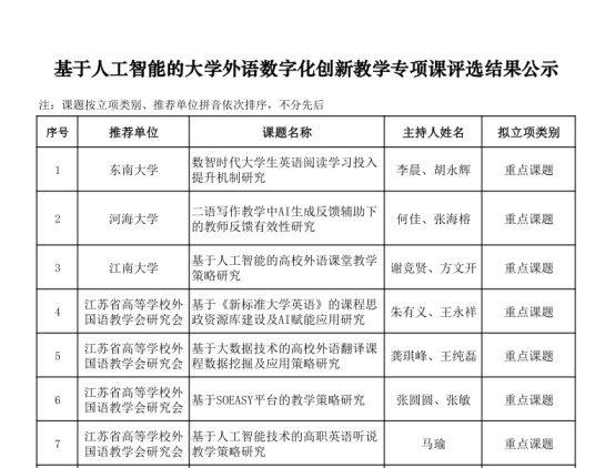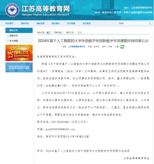 近日,根据江苏省高等教育学会公布,我院龚琪峰博士申报的《基于大数据技术的高校外语翻译课程数据挖掘及应用策略研究》获”基于人工智能的大学外语数字化创新教学专项课题“立项为重点项目,这一荣誉不仅标志着我院在外语教学与大数据、人工智能融合领域的探索研究取得了重要进展,也为我院外语教育数字化转型树立了新的标杆。