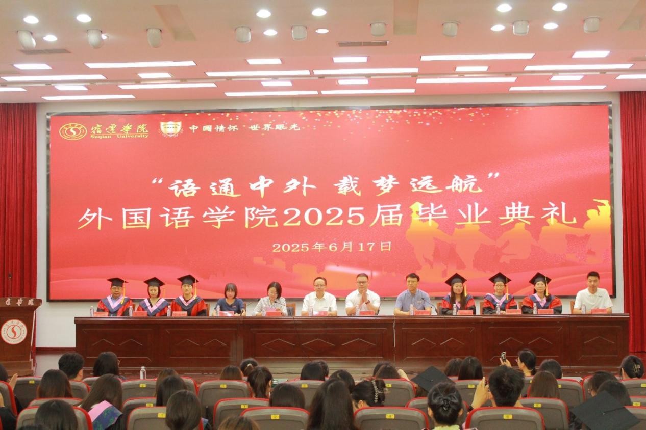 典礼上,学院对宿迁学院求索奖、优秀毕业生、2025届校友信使和外国语学院就业先锋班获奖的学生和班级进行了表彰。学院学位委员会成员给现场的每位毕业生拨穗。班主任们为同学们送上学院精心准备的毕业礼物,祝福学生们载梦远航。在校生学生代表2022级英师2班黄泺晶送上真挚的祝福。2025届毕业生代表、国家奖学金获得者、上岸中国石油大学和考取江阴市教师编制的英师1班陈雪瑶,回顾了大学四年的成长历程,分享了自己的感悟和收获,并代表全体毕业生向学院和老师表达了衷心的感谢。