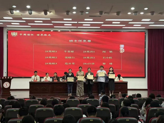 会上,学院表彰了新生军训标兵和优秀学员;宣读了2025级班主任、辅导员助理的聘任文件;各系主任用专业的语言发出深情寄语,与现场新生积极互动;教师代表卫晓旭老师发言,为新生的专业学习送上建议;22英语2班蔡妍、25英语2班杜雨桐分别代表老生和新生进行发言。