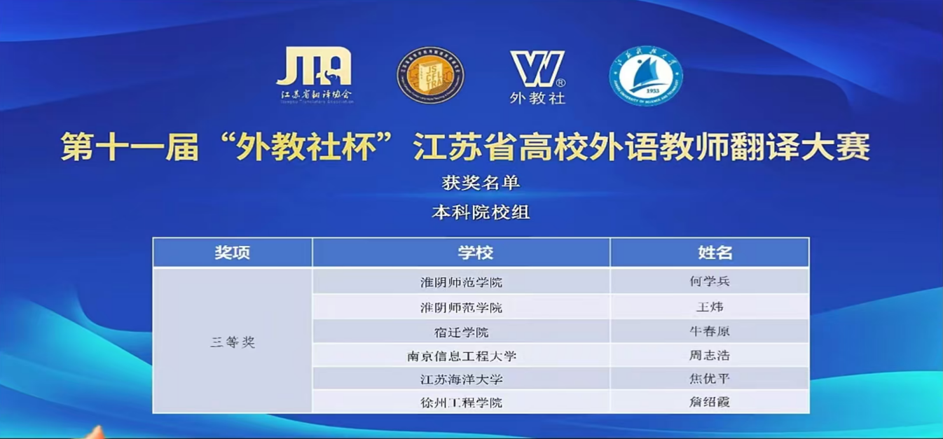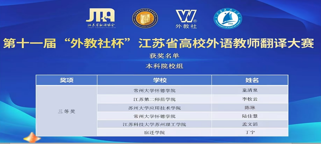 10月12日,第十一届“外教社杯”江苏省高校外语教师翻译大赛圆满落幕,我院两位教师牛春原、丁宁凭借扎实的专业功底与深厚的文化素养,在赛事中双双荣获大赛三等奖,为学院赢得了荣誉。