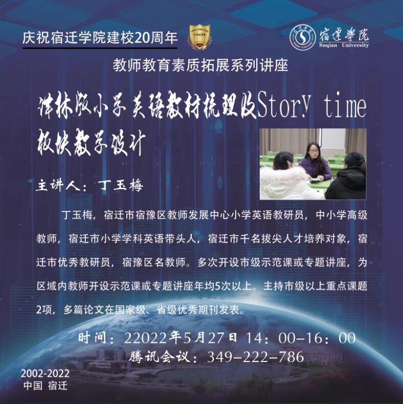 为庆祝宿迁学院建校20周年,深入学习教材梳理及板块设计,2022年5月27日下午2:30,外国语学院英语教育系组织开展了“教师教育素质拓展系列”讲座,主讲人是宿迁市优秀教研员——丁玉梅,参加讲座的有外国语学院全体教师以及外院全体师范生。
