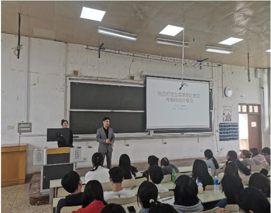 英语系主任刘彬老师向同学们介绍了英语师范生基本功比赛的基本情况,分析了目前教师编制考试的整体形势,讲述了举办本次分享会的目的和意义。