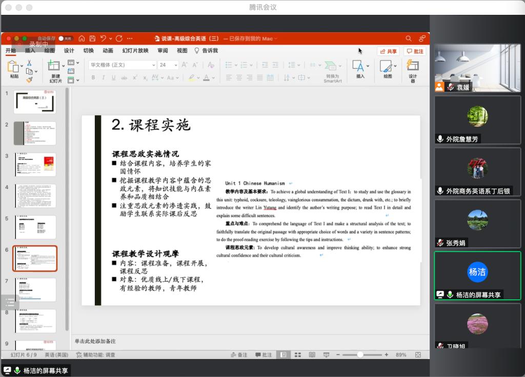 2022年8月24日,商务英语系组织全体老师参加“专任教师说课程”人人过关活动,每位老师对自己所带的每门课程进行了5-8分钟的说课,并邀请专业带头人詹慧芳教授给予点评。每位老师紧紧围绕评估“说课程”要求的九点内容,从课程性质、定位、对人才培养方案目标的支持度、课程思政实施、教学手段、方法创新等对自己所带课程进行了细致的讲解,并设计讲解其中一个单元的教学课程。这次说课活动,老师们对自己所带课程非常熟悉,即便是新教师也准备非常充分,但对于指标点的解释与想法不尽相同。大家积极讨论,相互借鉴,最后,大家对“说课程”要求的九个要求点进一步深化了认识,提升了从整个人才培养目标与课程体系来看课程的全局观。