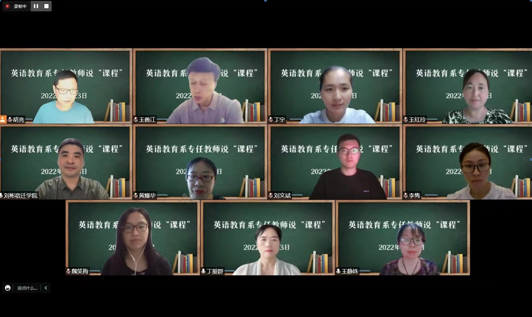 为了促进教师专业化的发展及深化对课程的钻研,切实提升教师的教育教学水平和业务能力,在8月23日上午,英语教育系组织了全系教师“专任教师说课程”人人过关活动。本次活动由系主任刘彬主持,各位教师依次对自己所教的每门课程进行了6-10分钟的说课,并由丁爱群老师给予了细致专业的点评。在学校教学工作的指导下,每位教师都紧紧围绕说课的“六说”要求,从所授课程在课程体系的位置、教学目标、教学内容、教学方法教学手段和考核评价等六个方面展开说课。每位教师都做了精心地准备,从课程实际出发,提升了学科及课程对人才培养的目标的融合度和支持度,剖析了课程的教法和学法,体现了OBE的教育理念,为新学期新课程的顺利实施打下了良好的基础。各位教师的课件都精彩纷呈,充分体现了教师对新课程的深入透彻的理解、丰富的教学经验和创新的教学理念。在最后的环节开展了讨论,大家都积极地参与到讨论中,集思广益,发散思维,相互学习借鉴,更一步加深了个人对于“说课程”的九个要求点的理解,落实了把人才培养目标与课程相结合的实际要求,对于提升英语教育系全体教师的先进教学理念和教学业务水平有着指导性的意义。