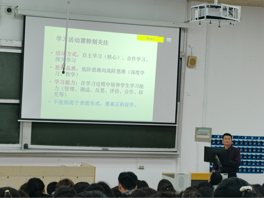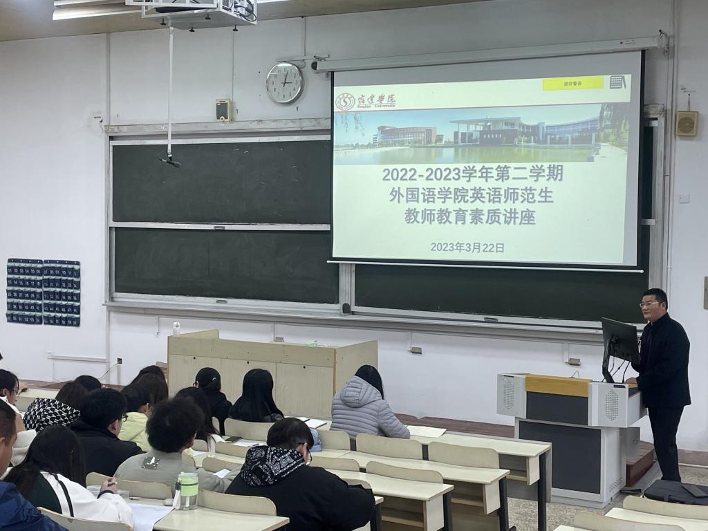 2023年3月22日下午,外国语学院英语教育系特邀请宿迁中学英语学科带头人李向勤博士作为主讲人,在一号教学楼第二阶梯教室开展了以“为学育人——新课标下中学英语课堂教学理念重构与实践”为主题的教师教育素养讲座,外国语学院英语教育系教师和全体英语师范专业的学生参加讲座。