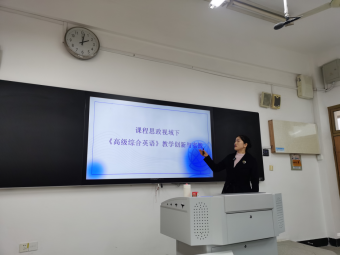 活动伊始,王善江副院长对此次活动的开展作了介绍,并对丁爱群老师带领的教学团队在外院教学引领方面所起作用予以了高度评价。丁爱群老师重点从课程简介、设计理念、教学过程和思政案例四个方面,详细介绍了《高级综合英语》课程教学中如何将课程思政元素有机地融入到实际的教学活动中,从而扎实推进立德树人工作的开展。