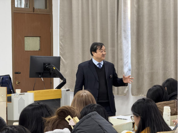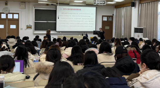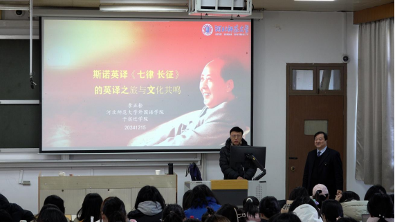 李正栓教授首先领诵了毛泽东《七律·长征》,通过生动的讲解带领师生穿越时空,感受这首诗背后的历史风云与文化底蕴,他指出这不仅是一首气势恢宏的史诗,更是中国革命精神的生动写照。接着,他以埃德加·斯诺等西方学者对《七律·长征》的翻译为例,高度评价了斯诺对毛泽东诗词国际翻译与传播的重要贡献。