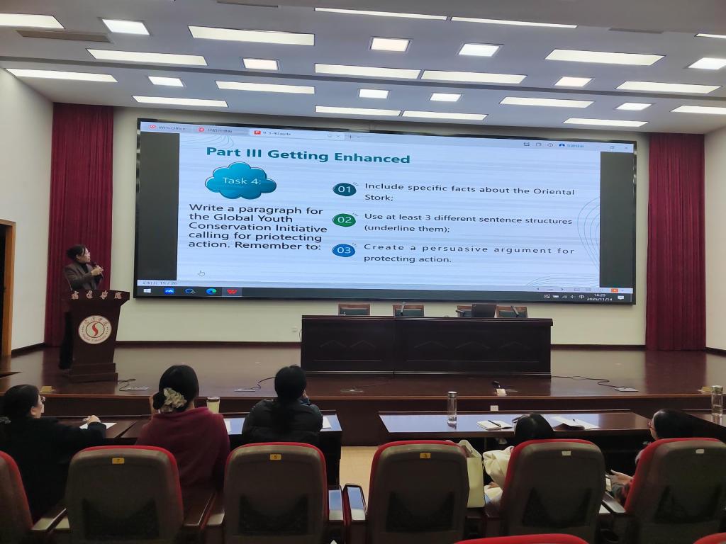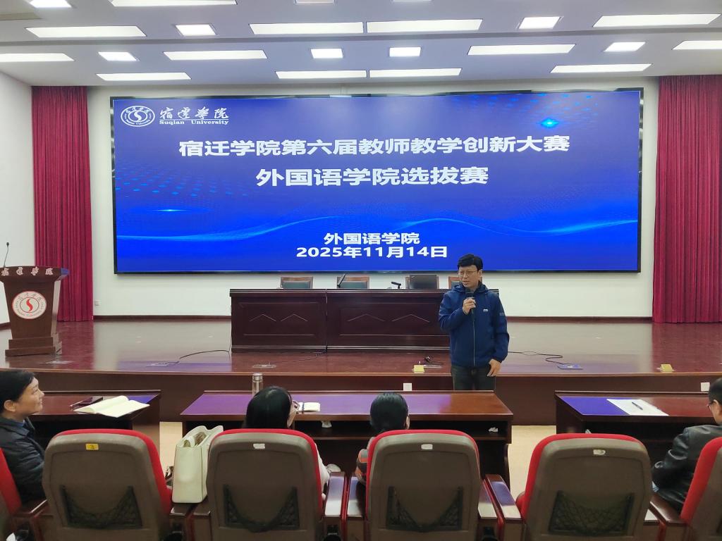 为深入贯彻全国教育大会精神,推动教育教学改革,提升教师教书育人能力,11月14日下午,外国语学院成功举办了宿迁学院第六届教师教学创新大赛院级初赛。学院督导及各系部主任担任了此次院赛的评委。学院高度重视此次大赛,广泛动员在编教师积极参与,共吸引了多名优秀教师报名参赛,教学副院长王善江教授亲临比赛现场指导。