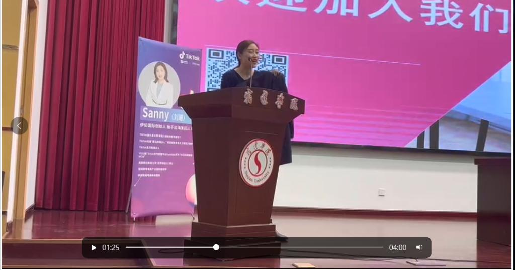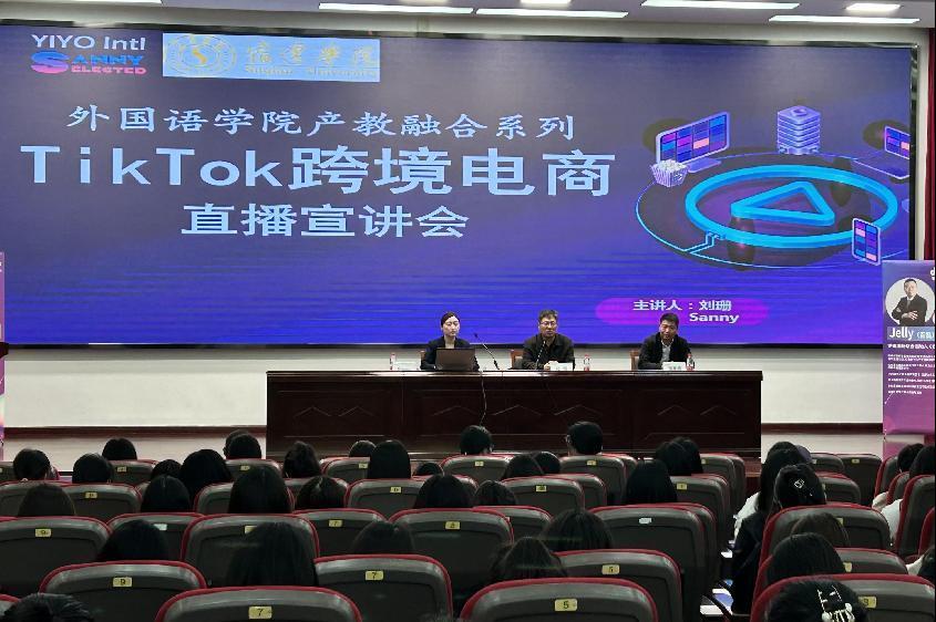 为深入贯彻学校“三联三融”发展方略,不断加强我院“产教融合”人才培养,外国语学院跨境电商直播项目正有序开展。4月8日下午,外国语学院携手宿城区跨境电商产业园、南京伊佑国际股份有限公司,在求索楼报告厅举办了“外国语学院产教融合系列 TikTok跨境电商直播宣讲会”,参加宣讲会的有外国语学院副院长沈刚,商务英语系袁媛、产业园负责人张栗铭、伊佑国际创始人刘珊(Sanny)、COO吉磊(Jemmy)以及全体2021级和2022级英语专业学生。
